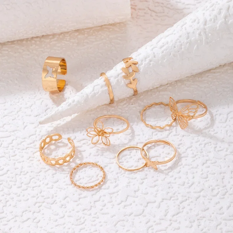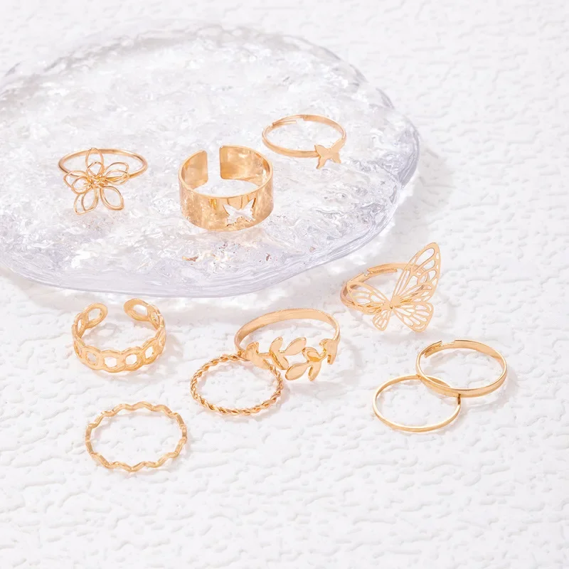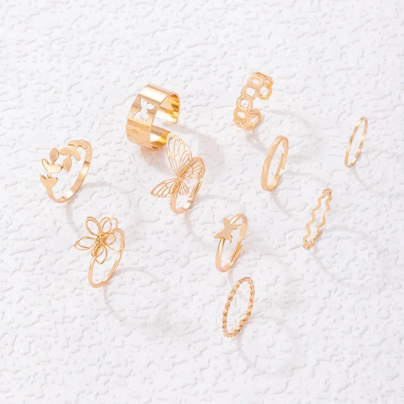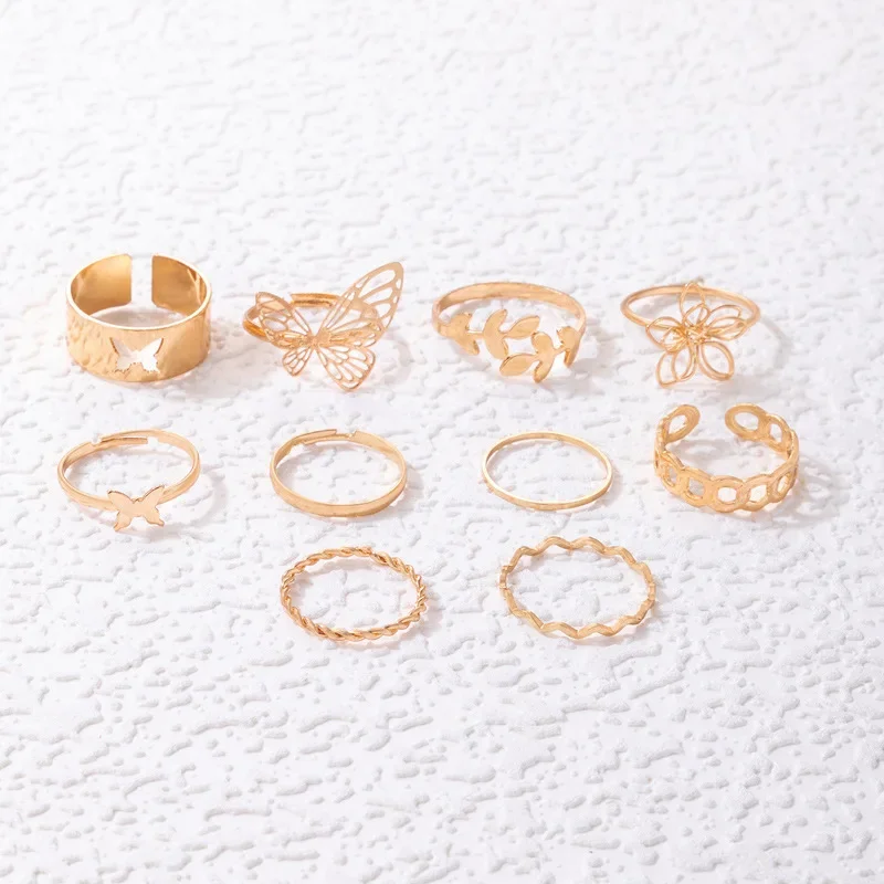 New Simple 10 Pcs Flower Butterfly Leaves Geometric Twisted Hollow Ring Set for Women Female Charm Party Wedding Jewelry Gift