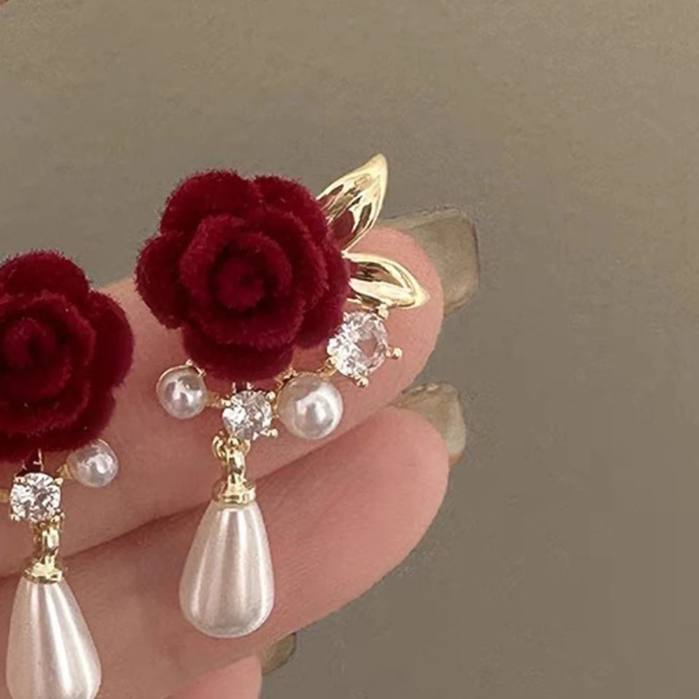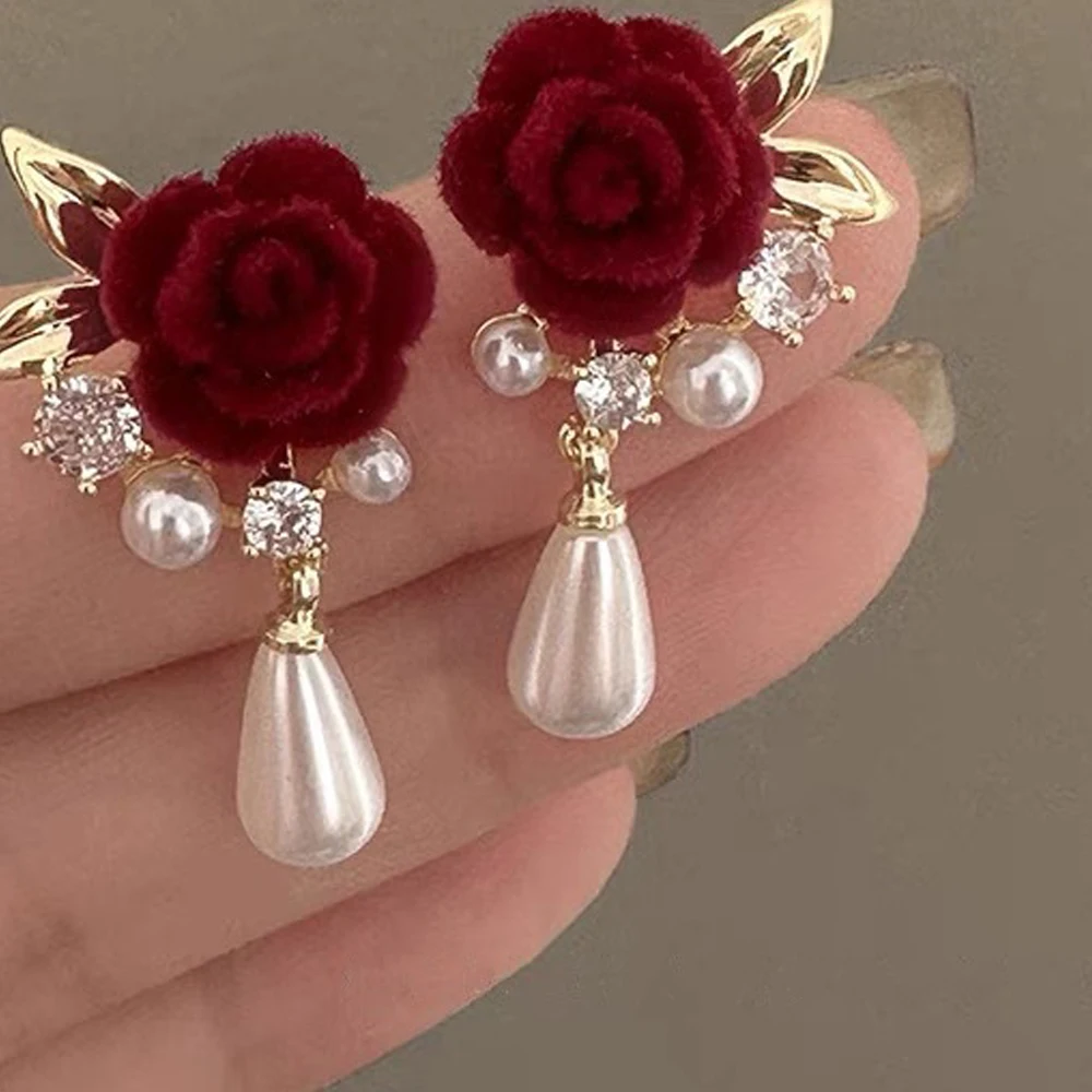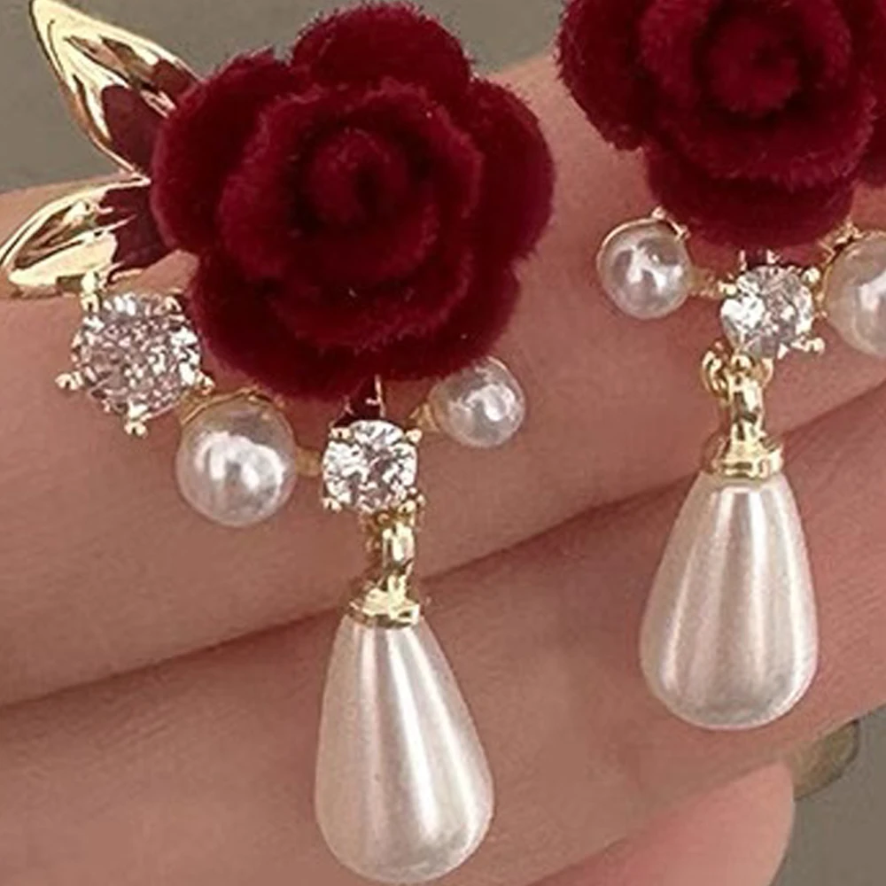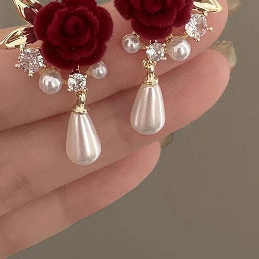 Description: red velvet rose flower earrings, retro pearl earrings, temperament flocking bridal dress earrings.